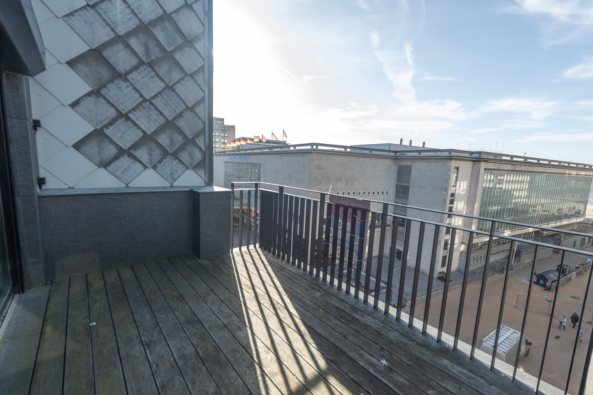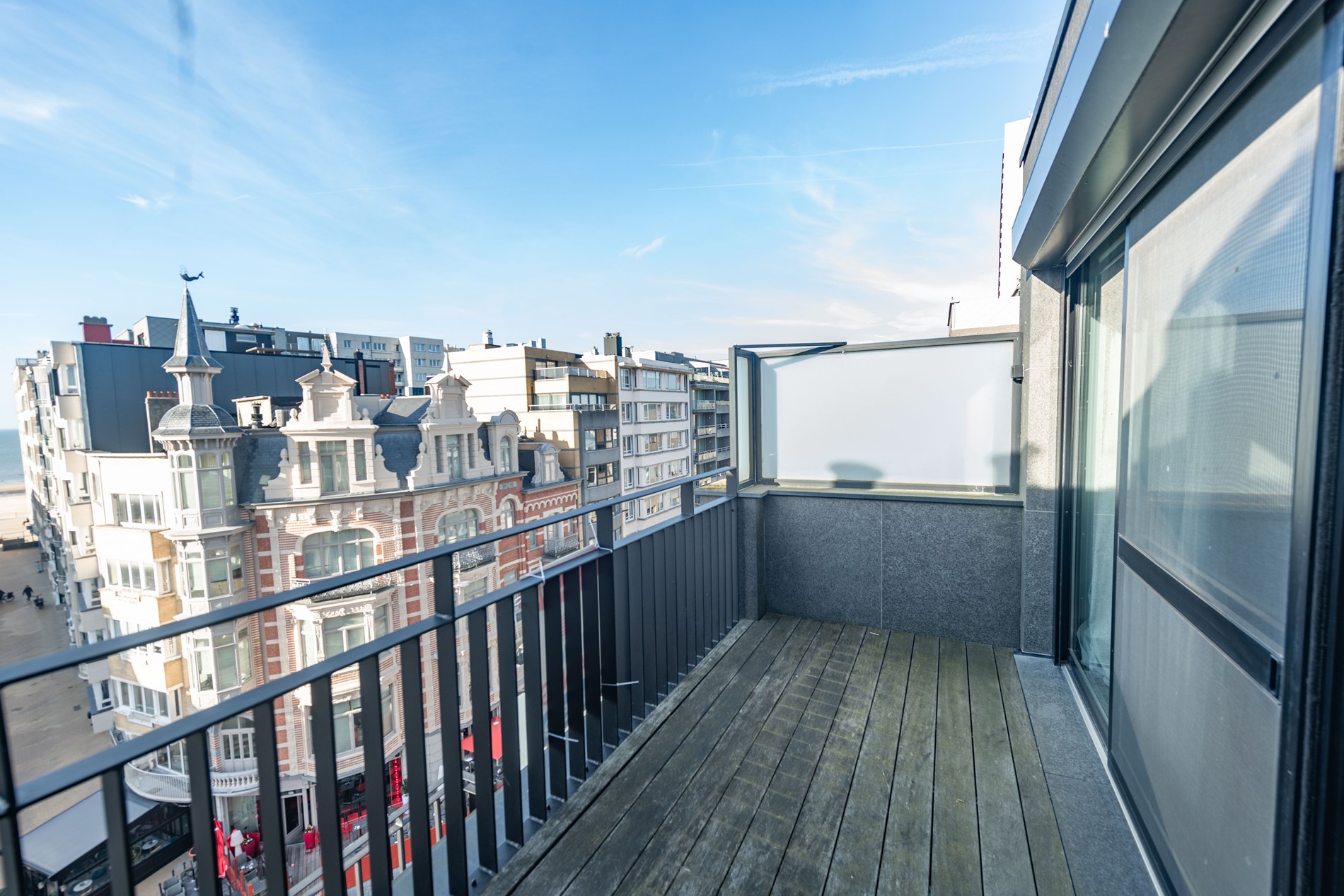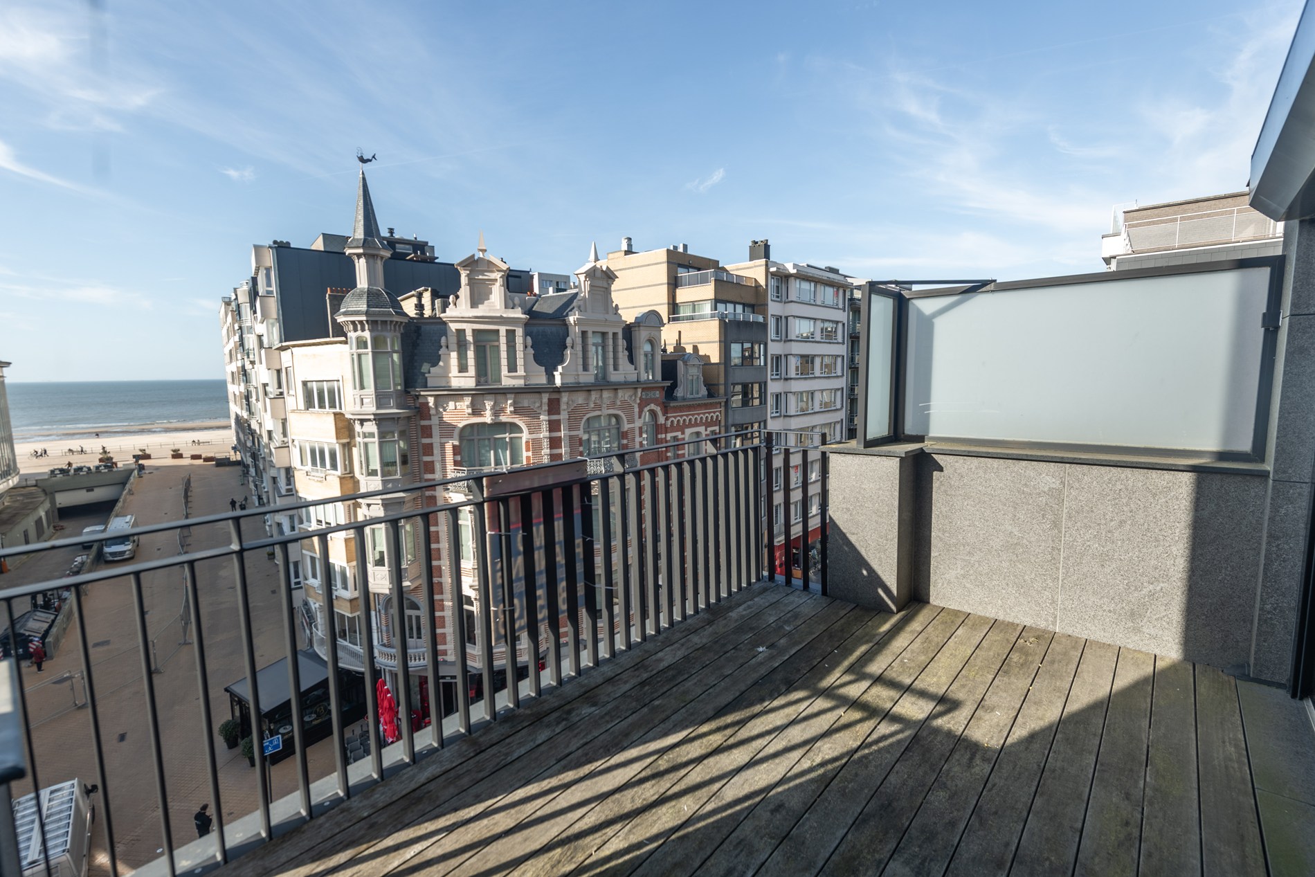verdieping 5 Inkomhal met ingemaakte kasten, living met volledig ingerichte open keuken, wc, 1 terras met zeezicht en 1 terras bij de eethoek.