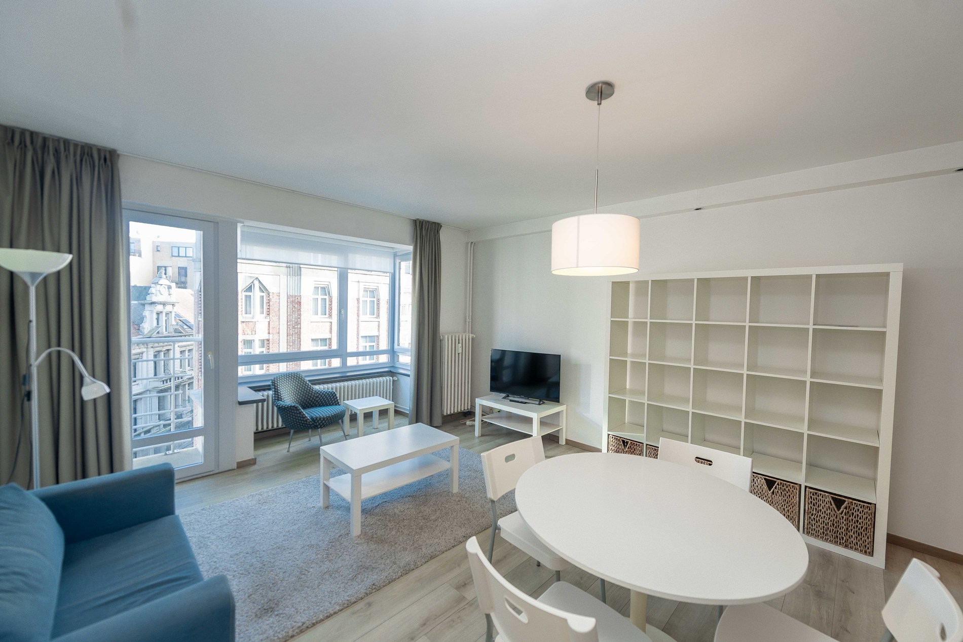 Indeling: inkomhal, living met terrasje en slaaphoek, ingerichte keuken, badkamer met douche en berging.